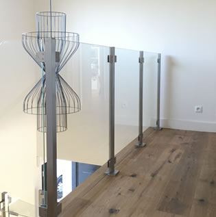 En inox 304 ou 316, poteaux et main courante, tubes ronds diamètre 42mm ou carré section 40mm; remplissage verre feuilleté 10,76mm (ou feuilleté trempé percé 10,76mm pour les poses à l’anglaise sur les rampants)