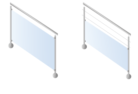 En inox 304 ou 316, poteaux carrés section 40mm, remplissage verre fixé sur pinces. Pas de main courante..